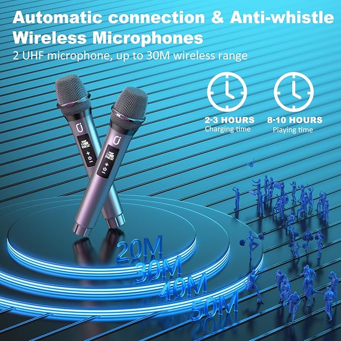 - 【Two wireless UHF microphones + remote control with infrared sensor】 With two wireless UHF microphones to prevent whistling and noise (Enjoy a multi-person karaoke party without purchasing extra microphones) The wireless distance can be up to 50 meters, free from the cable shackles. The remote control with infrared sensor makes your operation easier, you can control all the functions of the karaoke machine via the remote control.
