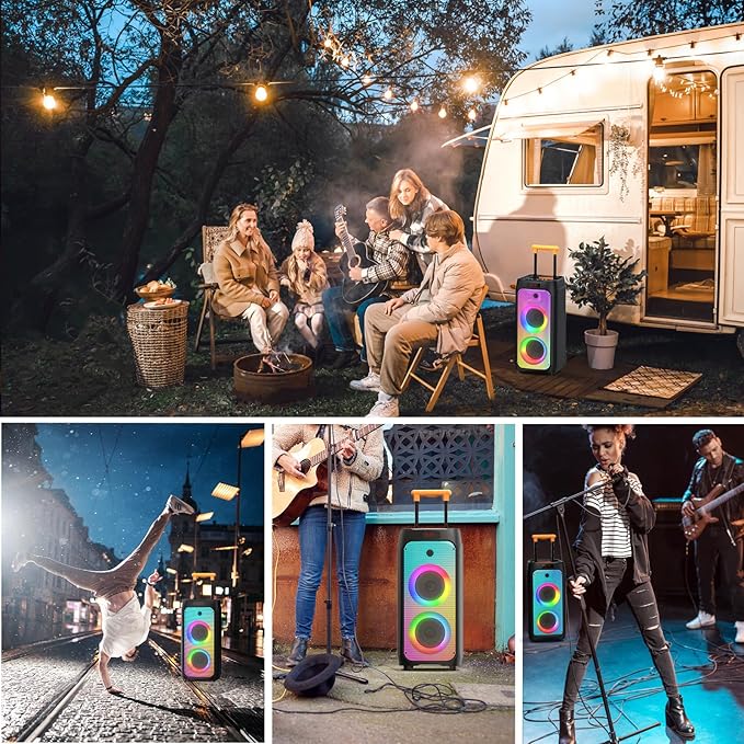 - 【IPX4 Splashproof Speaker with RGB Lights】 DJ lights turn any room into a rock concert, nightclub and karaoke room. IPX4 splash-proof design, whether you meet friends on the patio or sipping at the pool, don\’t worry about your stereo getting wet.
