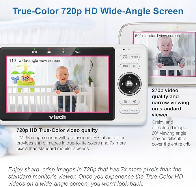 - 💖【720P HD SCREEN】-VTech VM901 baby monitor\’s parent unit features an upgraded 720p display, provides a crystal clear wide-angle window into your baby\’s world. The COMS image sensor with professional IR-Cut auto filter provides True-Color, sharp images in day light, and HD footage, 7x more pixels in night vision.